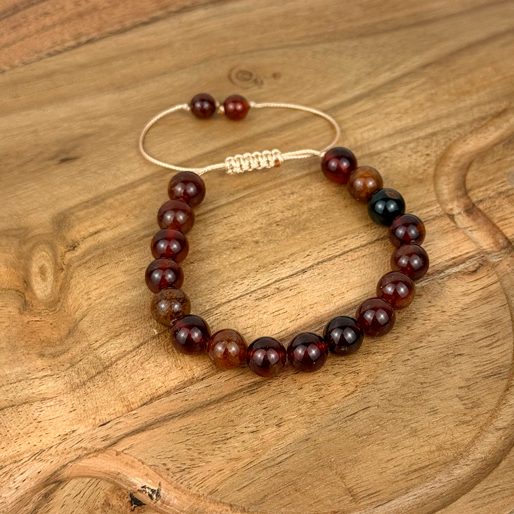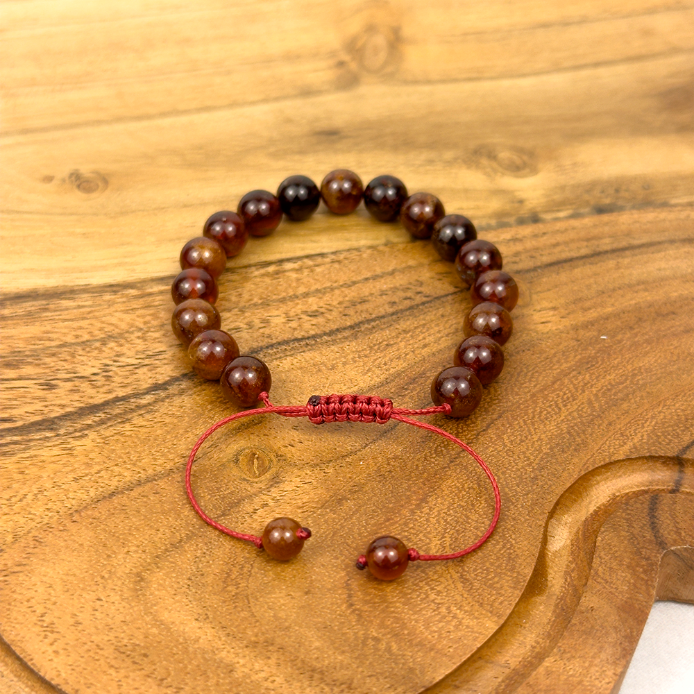 Granat to kamień pasji, energii i intensywnych emocji. Wzmacnia siłę życiową i roznieca iskrę w relacjach. Bransoletka z naturalnych kamieni 8 mm na w pełni regulowanym sznurku. Rozmiar uniwersalny.