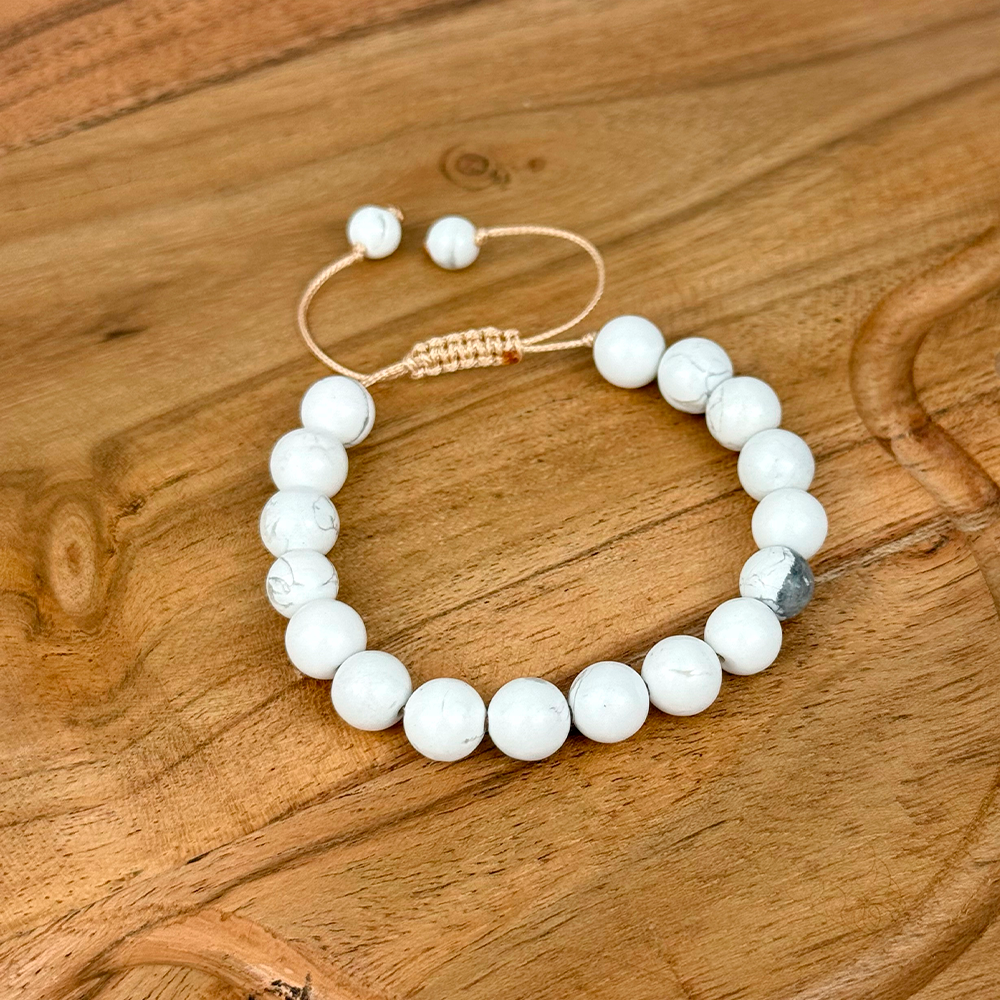 Howlit to kamień cierpliwości i spokoju. Redukuje stres, wycisza myśli i pomaga odzyskać wewnętrzną równowagę. Bransoletka z naturalnych kamieni 8 mm na sznurku w pełni regulowanym. Rozmiar uniwersalny.