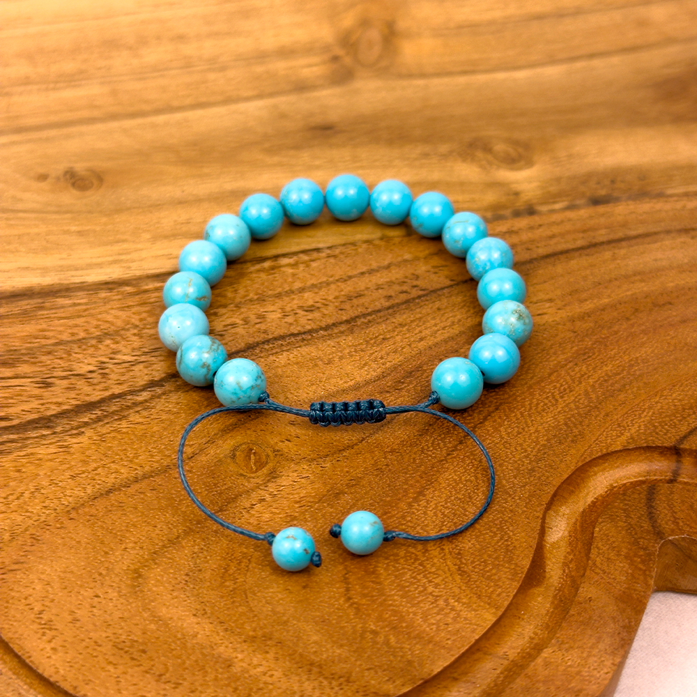 Turkus to kamień łączący świat duchowy z materialnym. Wspiera manifestację, realizację marzeń i wzmacnia intuicję. Bransoletka wykonana z naturalnych kamieni 8 mm na regulowanym sznurku. Rozmiar uniwersalny.