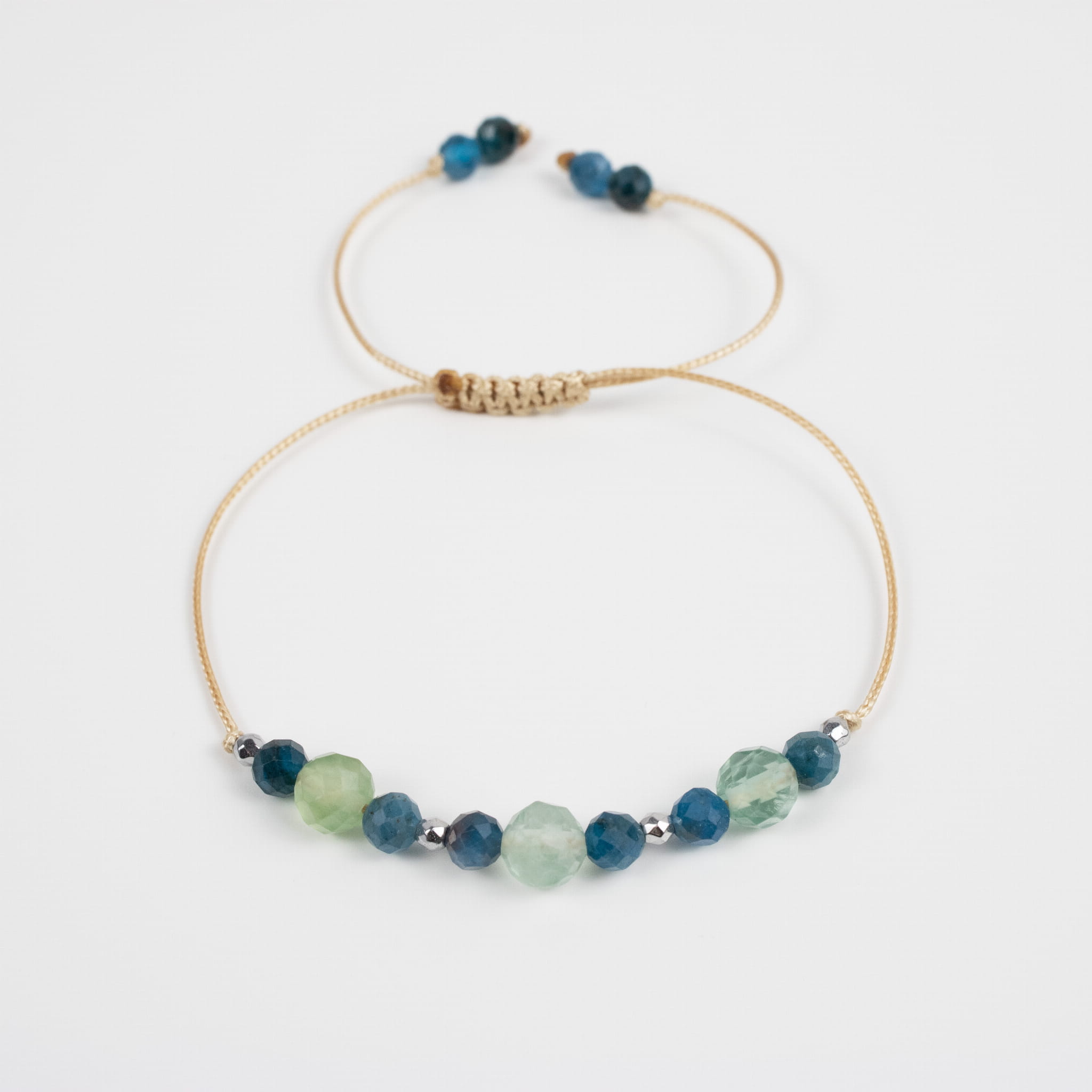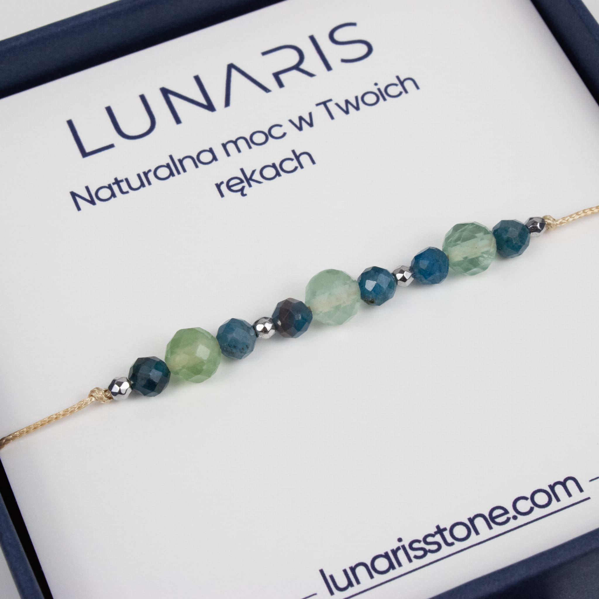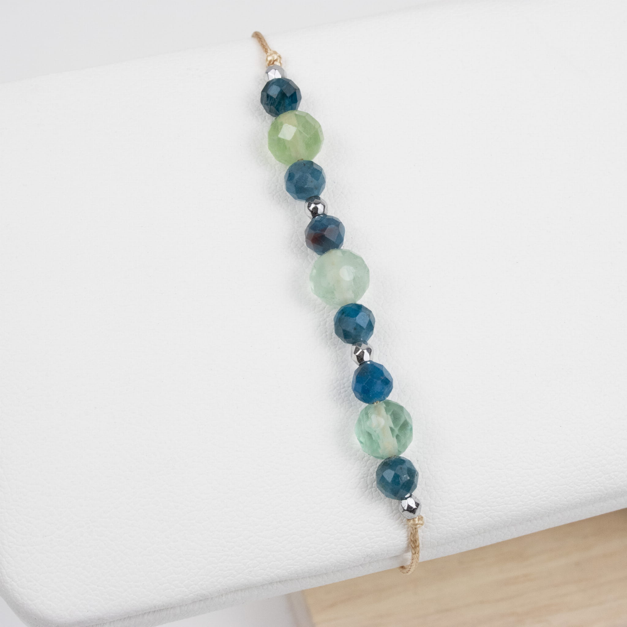 W tej odsłonie zestawienie Fluorytu i Apatytu zostało przedstawione w formie fasetowanych kamieni, które odbijają światło i nadają bransoletce świeży, lekki i bardziej wyrazisty charakter