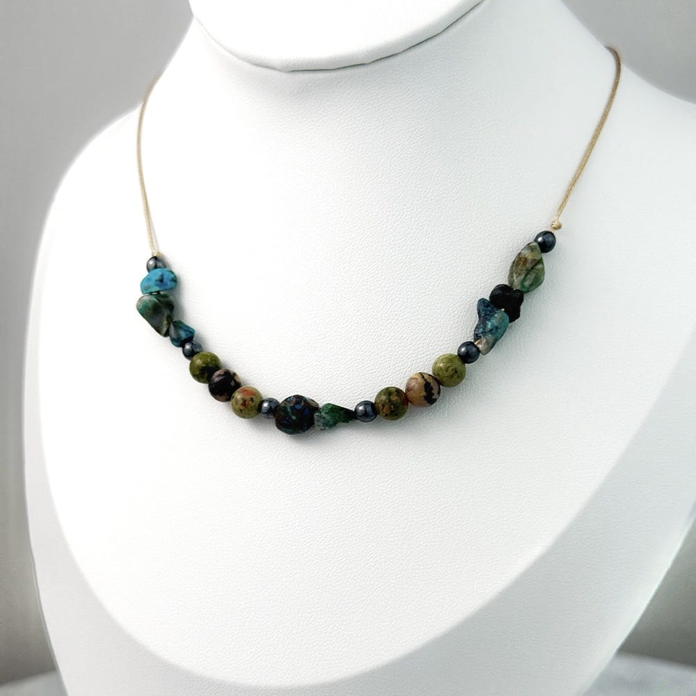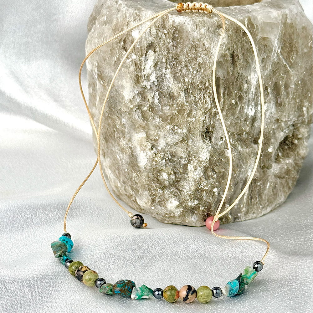 Naszyjnik Rodonit Unakit Turkus to subtelny amulet emocjonalnej stabilności i duchowej transformacji.