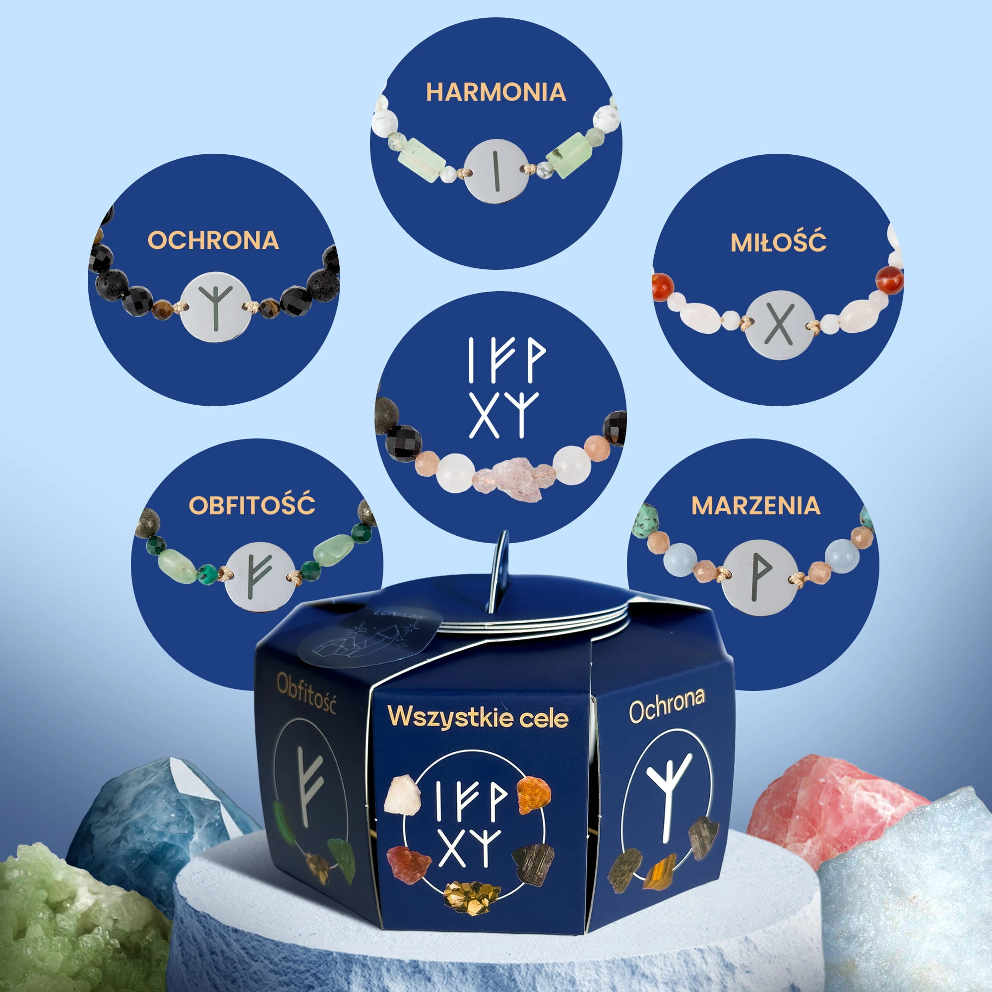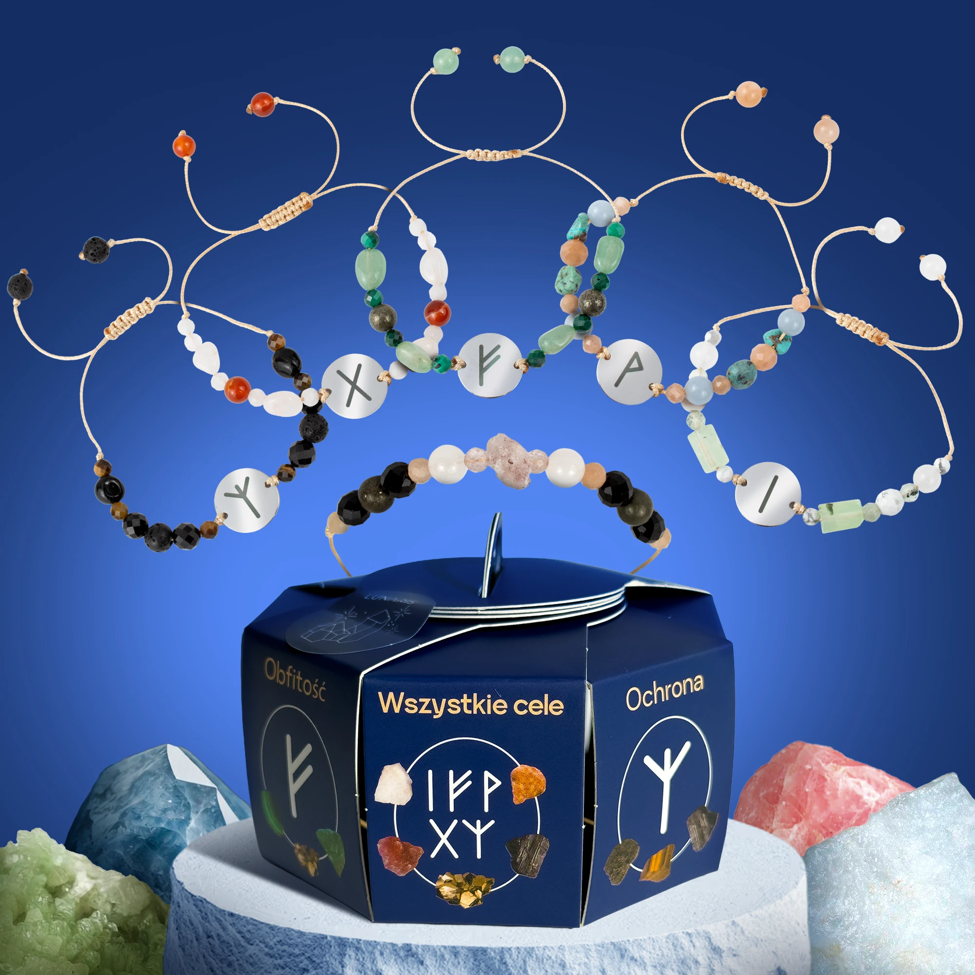 Każda bransoletka tworzona jest z naturalnych kamieni i uzupełniona odpowiednią runą — symbolem, który wzmacnia jej działanie.
