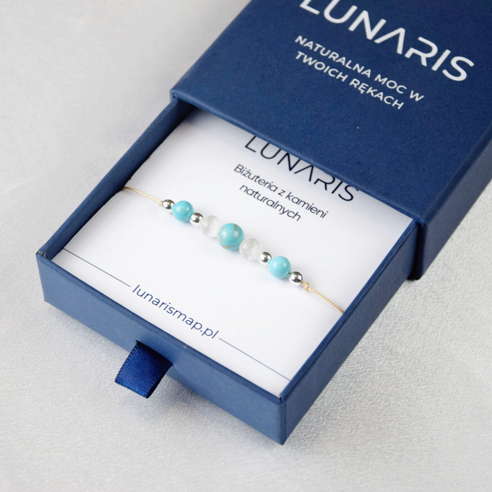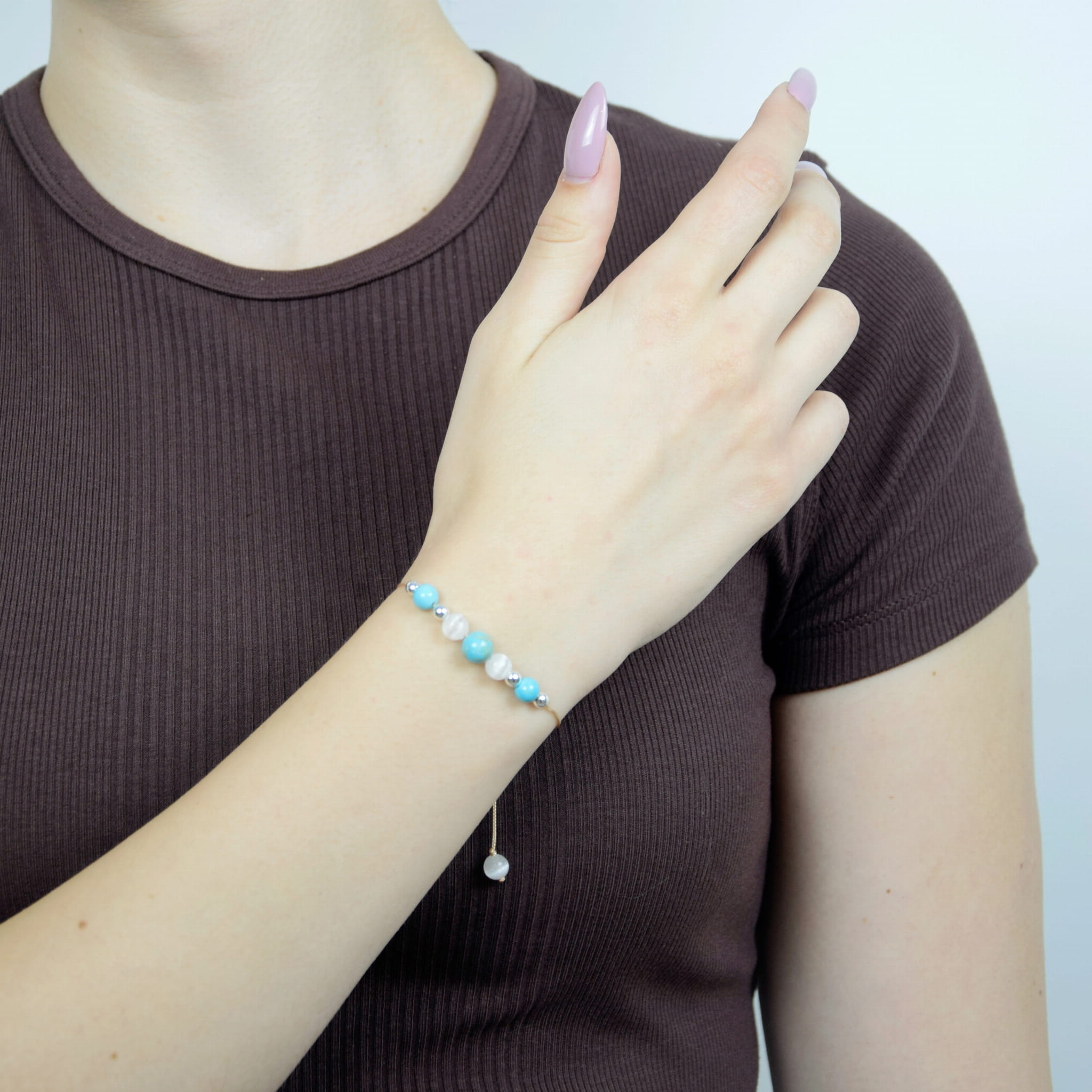 Bransoletka wykonana z naturalnych kamieni Selenitu i Turkusu na regulowanym sznurku to połączenie oczyszczenia, harmonii i duchowej równowagi