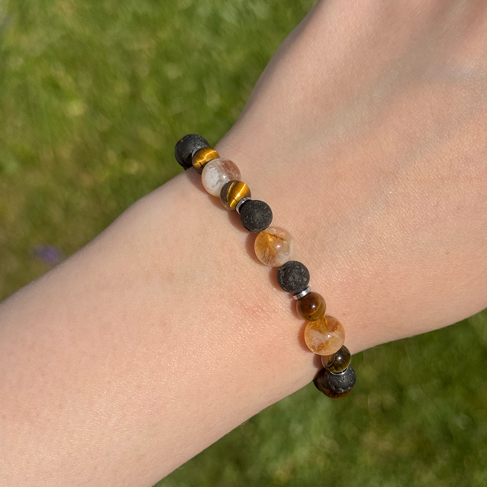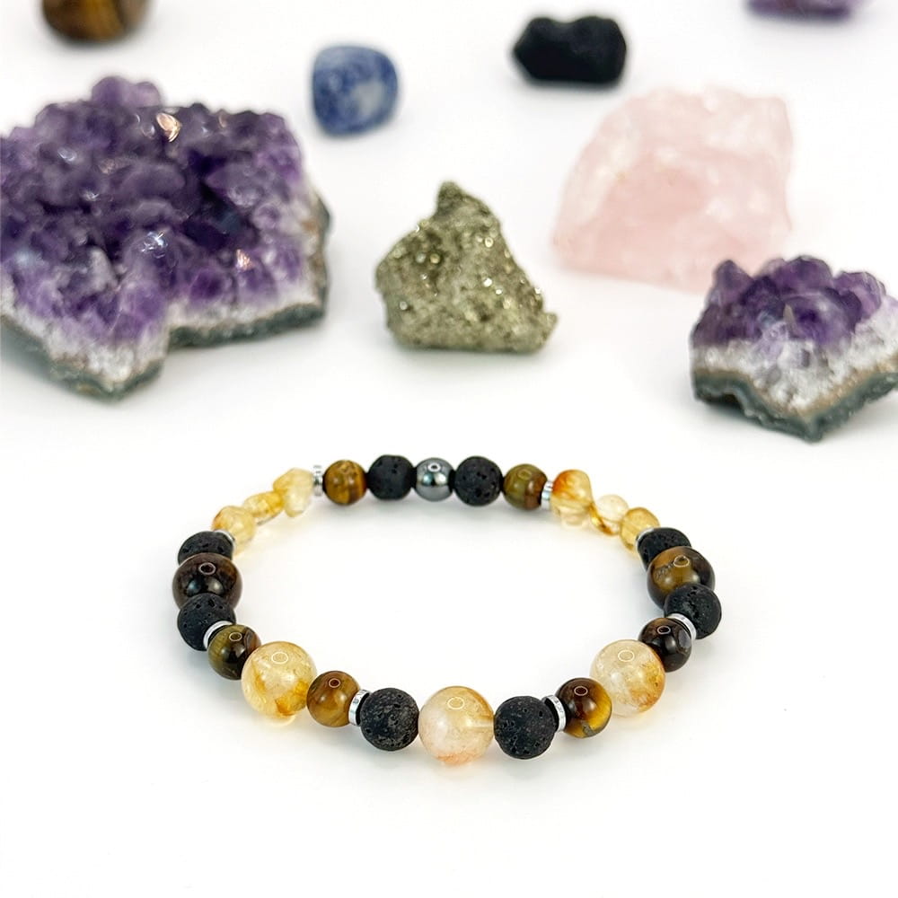 Bransoletka dla Lwa, która łączy Cytryn, Tygrysie Oko i Lawę, wspierając odwagę, sukces i równowagę emocjonalną. Idealna dla osób szukających siły i stabilności w życiu.