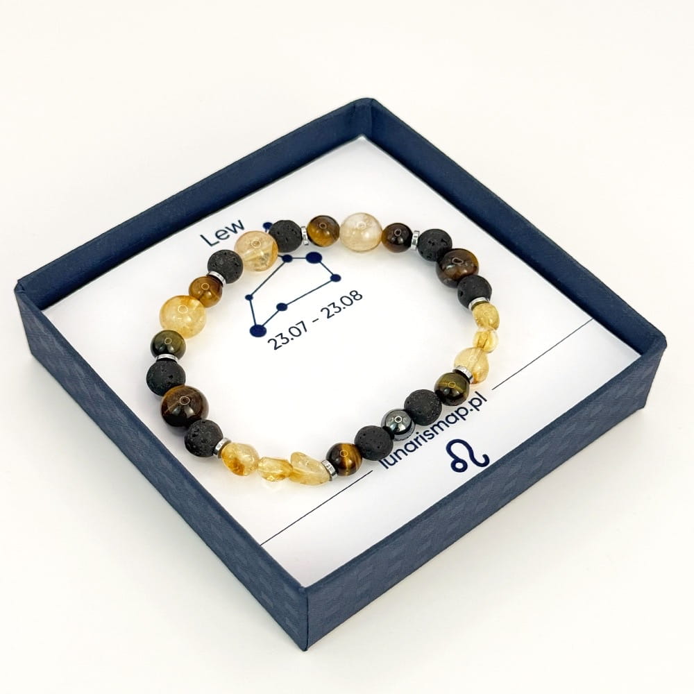 Lew to znak pełen odwagi, energii i silnej woli. Osoby urodzone pod tym znakiem często dążą do sukcesu i pragną utrzymać stabilność zarówno w życiu zawodowym, jak i osobistym. Ta bransoletka została stworzona z myślą o Lwie, wspierając go w realizacji celów, w pokonywaniu trudności oraz w przyciąganiu pozytywnej energii.