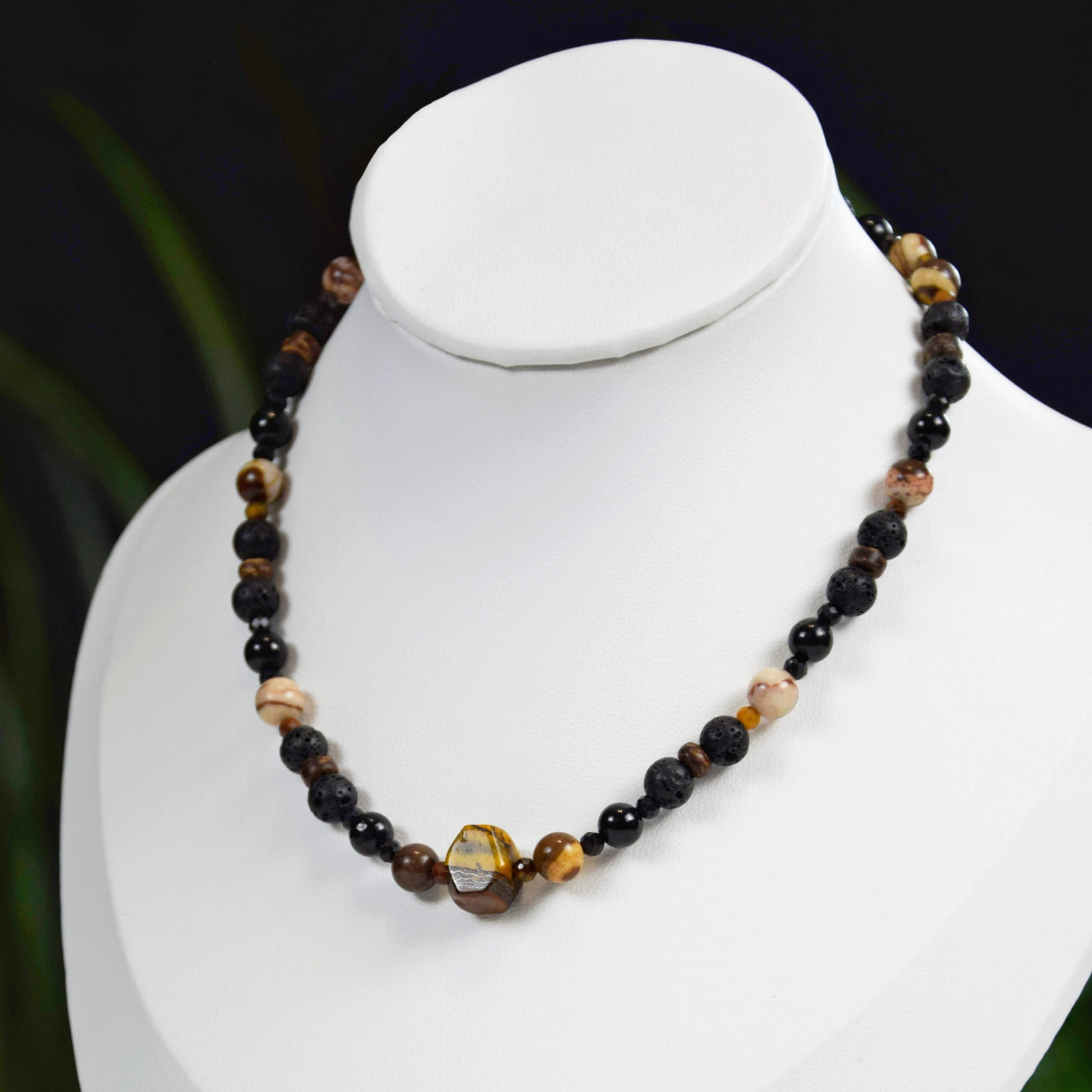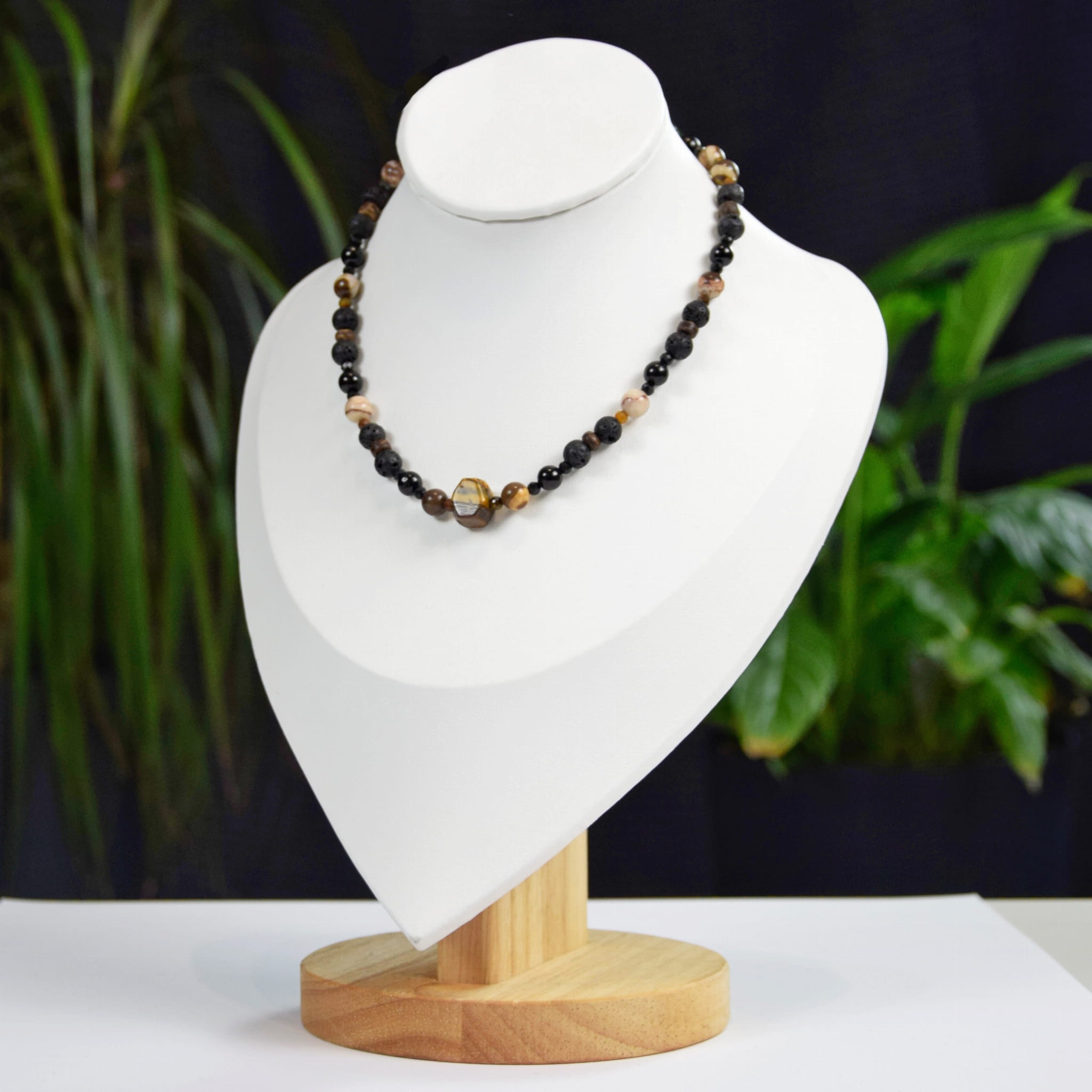 Naszyjnik wykonany z naturalnych kamieni Tygrysiego Oka, Lawy, Turmalinu i Jaspisu Zebra na delikatnym łańcuszku to mocne energetycznie połączenie odwagi, ochrony i wewnętrznej siły w eleganckiej formie