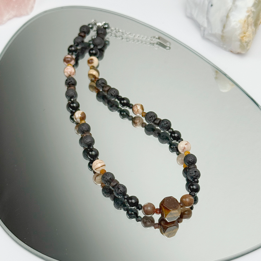 Razem tworzą silne, wspierające połączenie – Tygrysie Oko wzmacnia odwagę, Lawa regeneruje i oczyszcza, Turmalin chroni przed negatywnymi wpływami, a Jaspis Zebra motywuje do działania. Naszyjnik na łańcuszku łączy energię kamieni z elegancją biżuterii, dzięki czemu jest zarówno talizmanem ochronnym, jak i stylowym dodatkiem do codziennych i wyjątkowych stylizacji