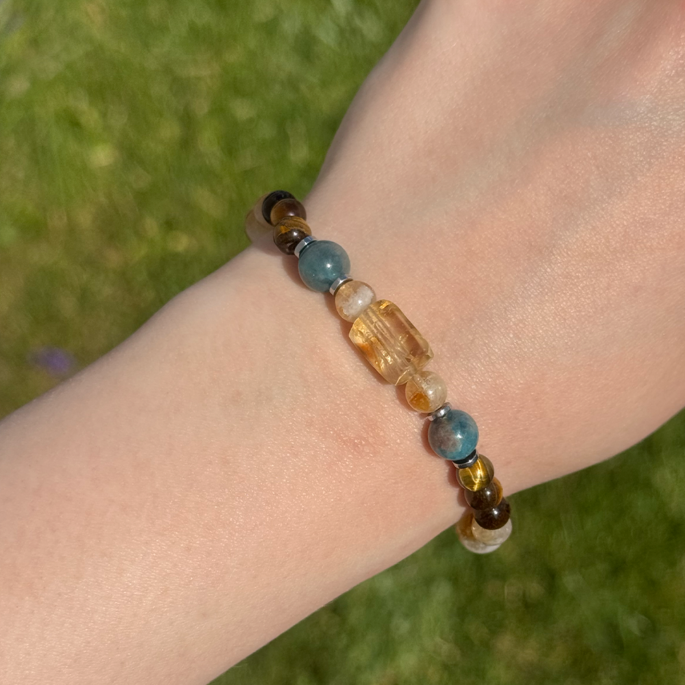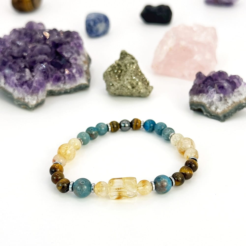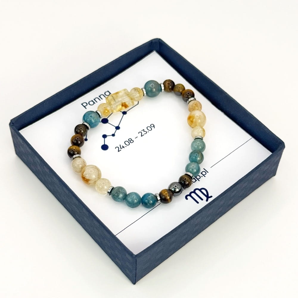 Bransoletka dla Panny, która wspiera jej determinację i wewnętrzną harmonię. Połączenie Apatytu, Cytrynu i Tygrysiego Oka wzmacnia koncentrację, siłę i pozytywne myślenie.