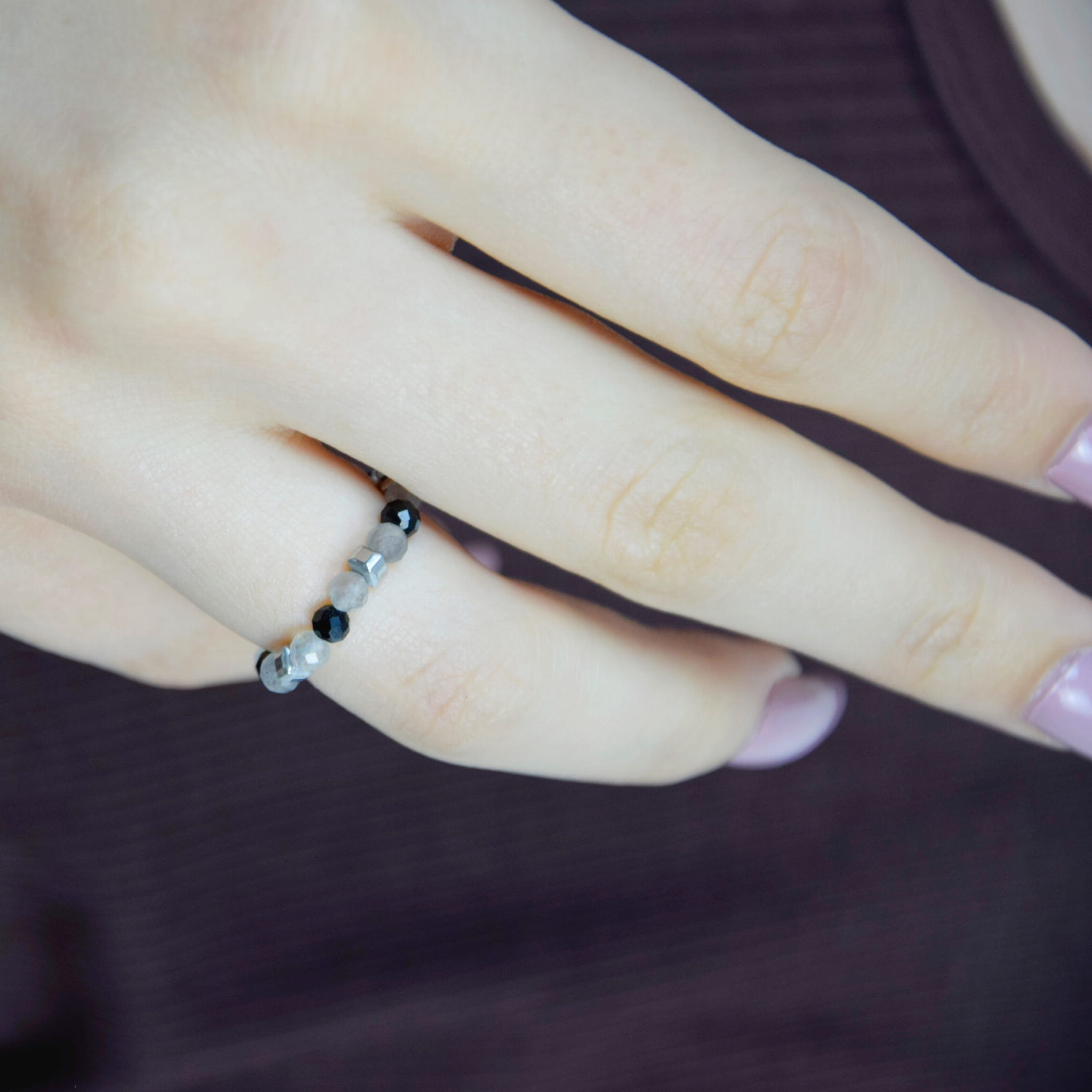 Pierścionek wykonany z naturalnych kamieni Turmalinu i Labradorytu na regulowanej obrączce to niezwykłe połączenie ochrony, transformacji i równowagi wewnętrznej
