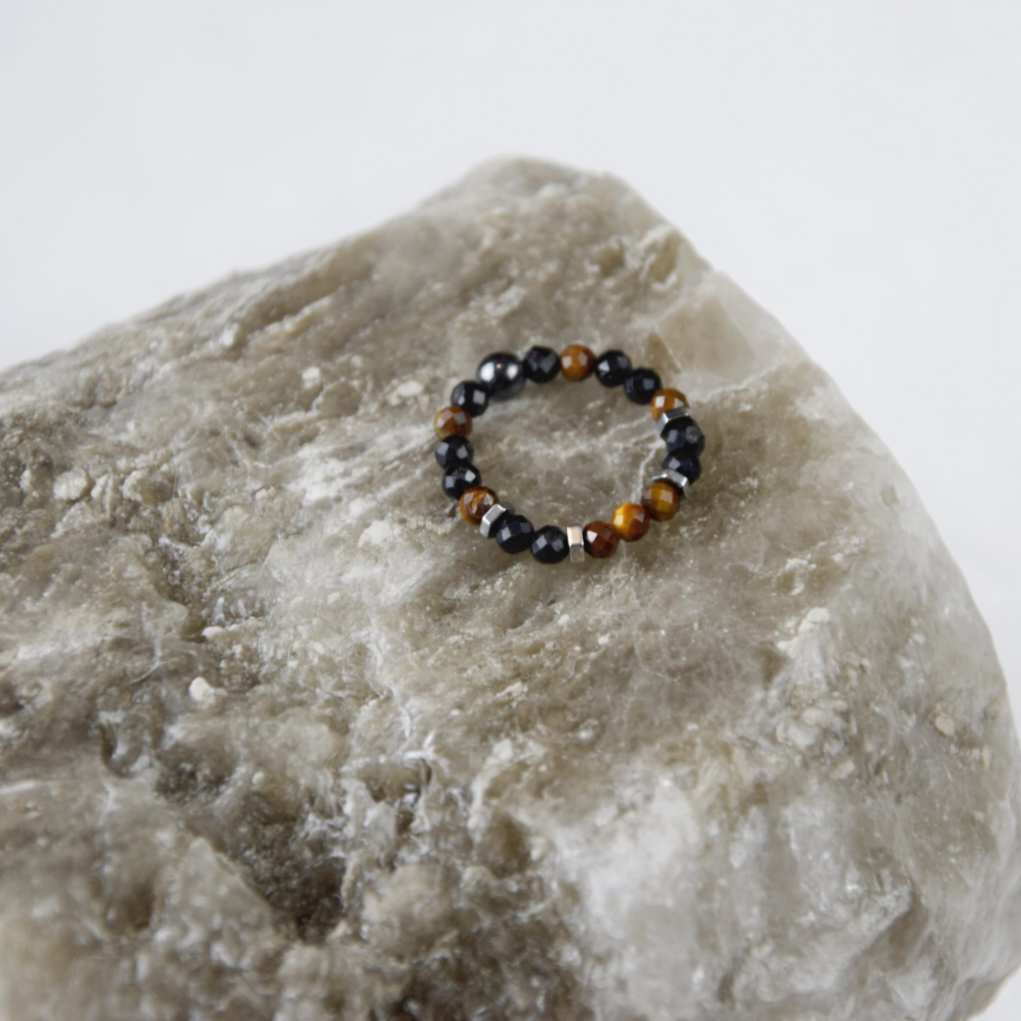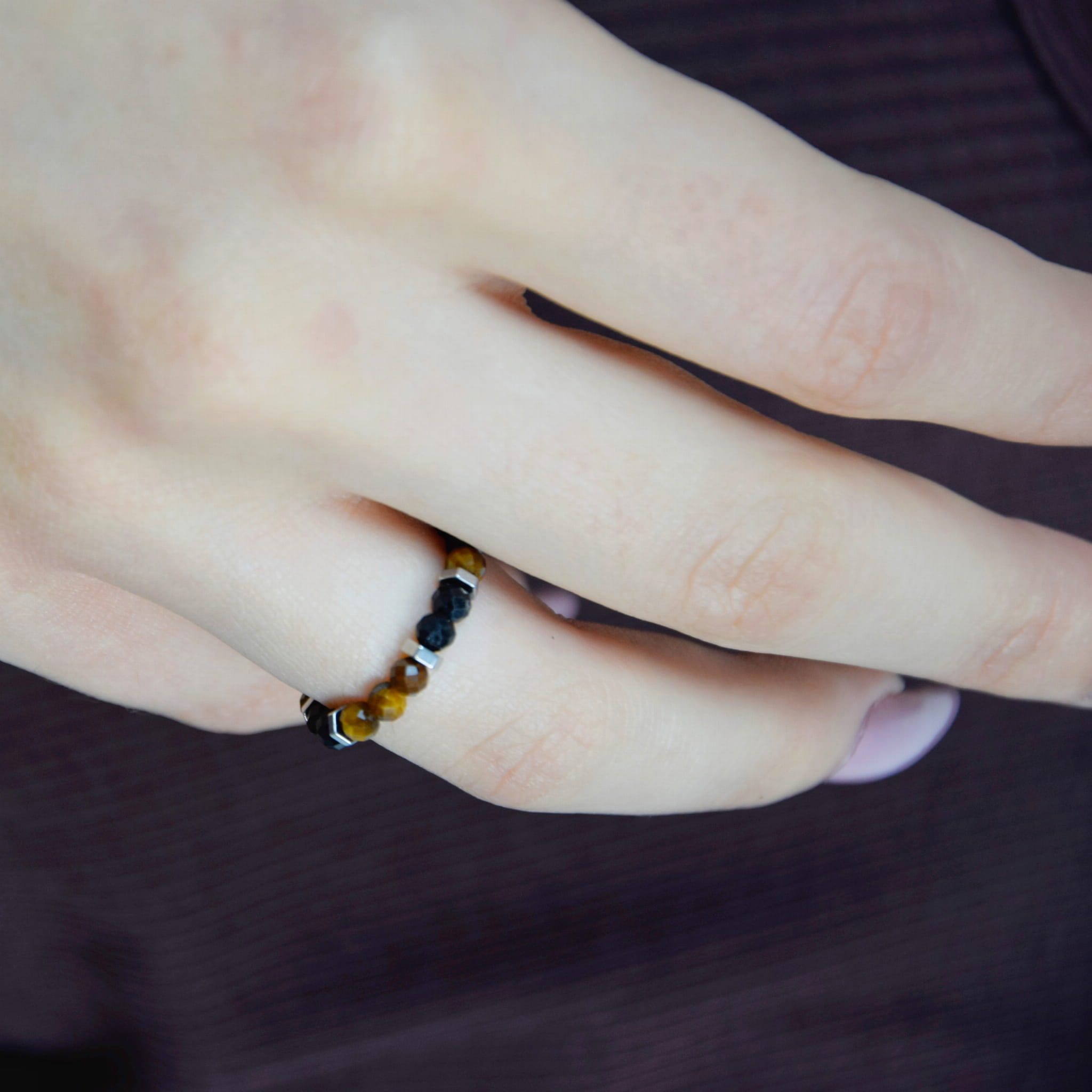 Pierścionek wykonany z naturalnych kamieni Tygrysiego Oka i Turmalinu na regulowanej obrączce to mocne połączenie odwagi, siły i ochrony