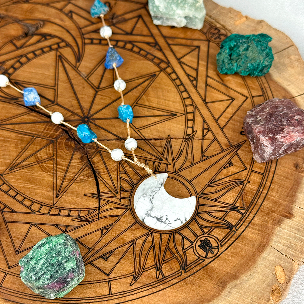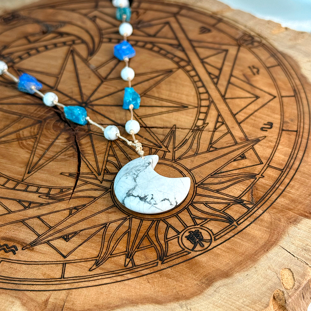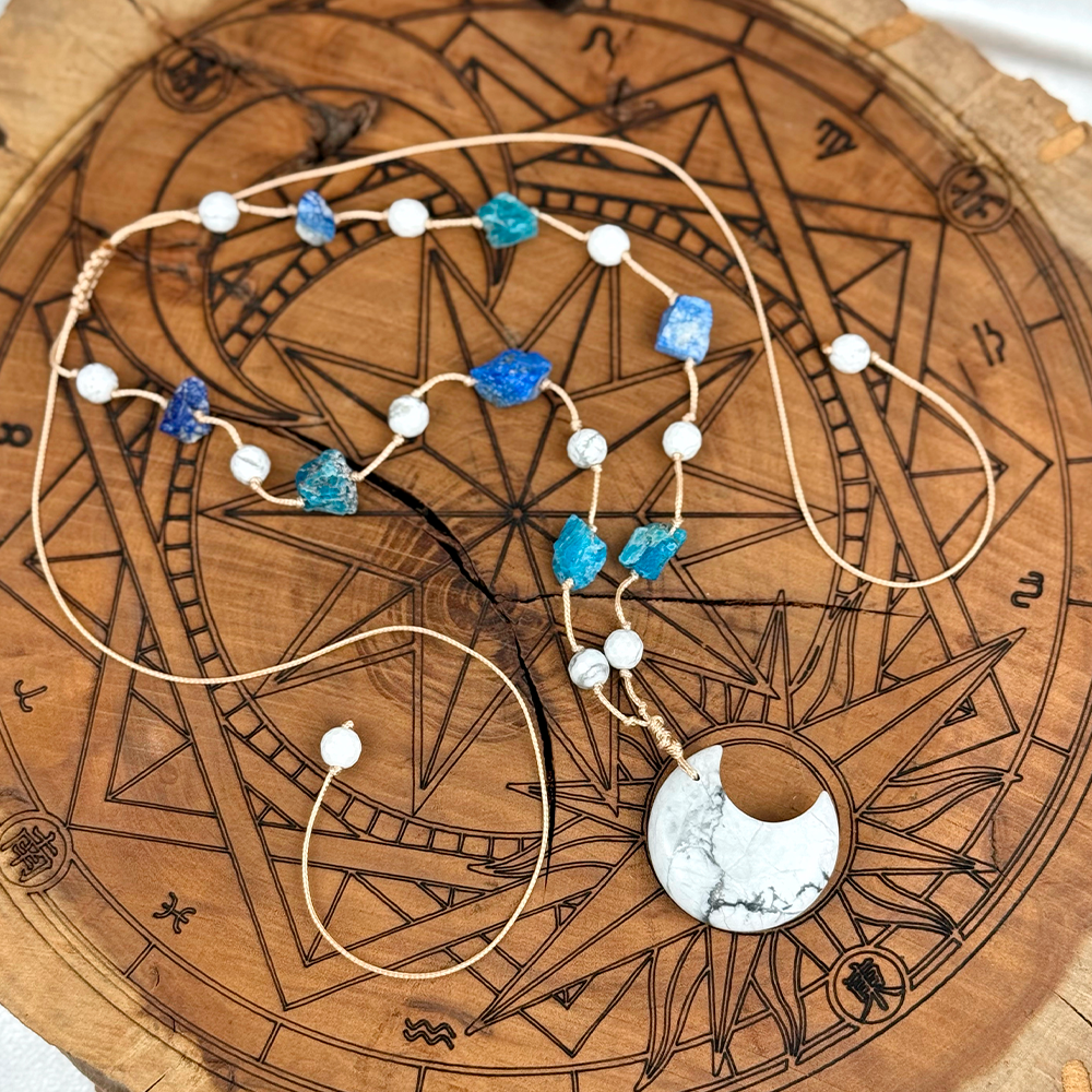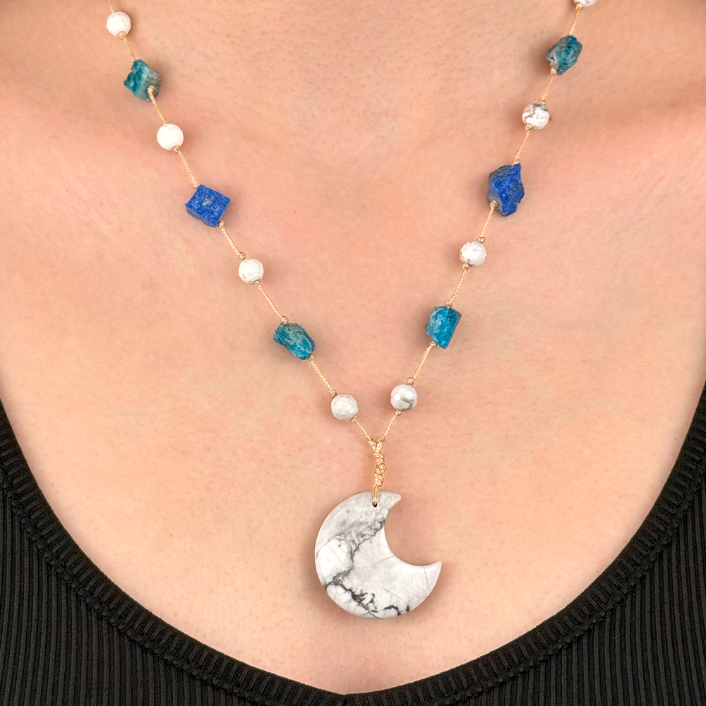 Pleciony naszyjnik z Księżycem wykonany z naturalnego Howlitu, Lazurytu i Apatytu. Połączenie spokoju, jasności umysłu i intuicji, które wspiera równowagę emocjonalną i autentyczną komunikację