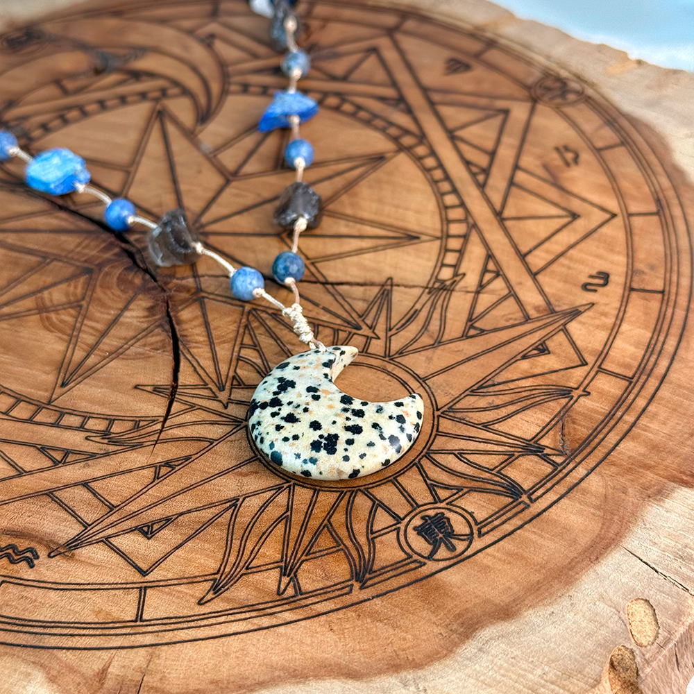Pleciony naszyjnik z Księżycem wykonany z naturalnego Jaspisu Dalmatyńskiego, Lazurytu i Kwarcu Dymnego. Ochronne połączenie, które wspiera stabilność, jasność umysłu i wewnętrzną równowagę