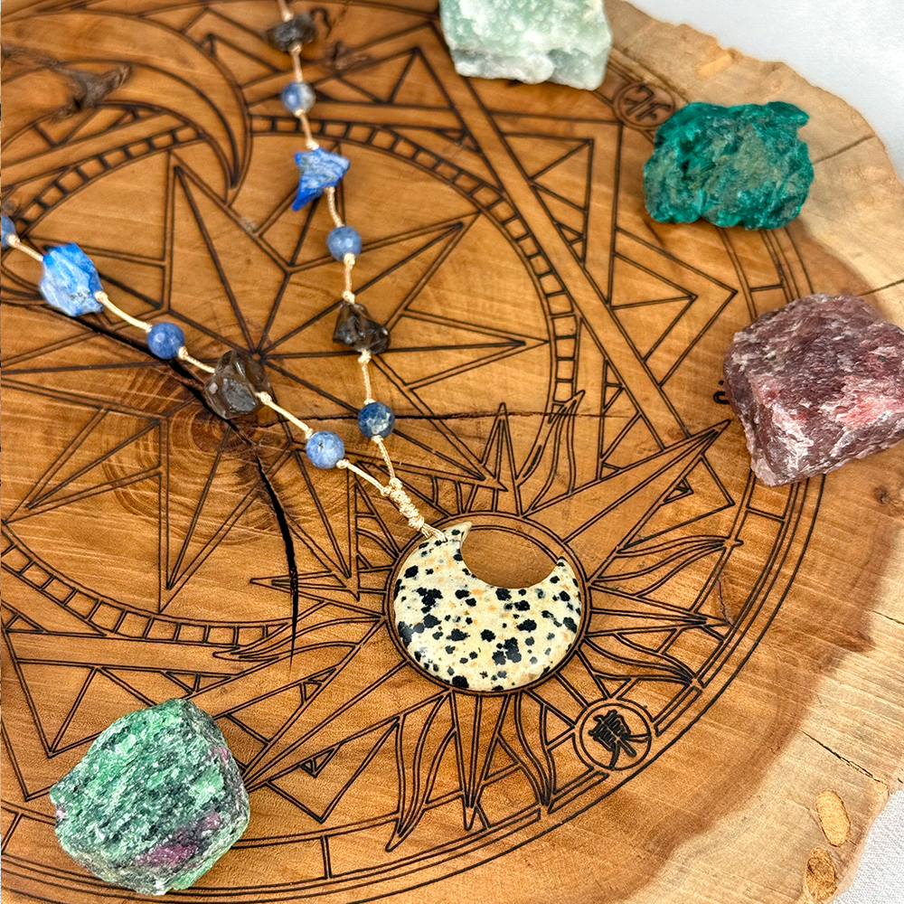 Pleciony naszyjnik z Księżycem to biżuteria stworzona dla osób, które chcą chronić swoją energię, uporządkować emocje i poczuć większą stabilność w codziennym życiu. Połączenie Jaspisu Dalmatyńskiego, Lazurytu i Kwarcu Dymnego wspiera oczyszczanie energetyczne oraz jasność myślenia