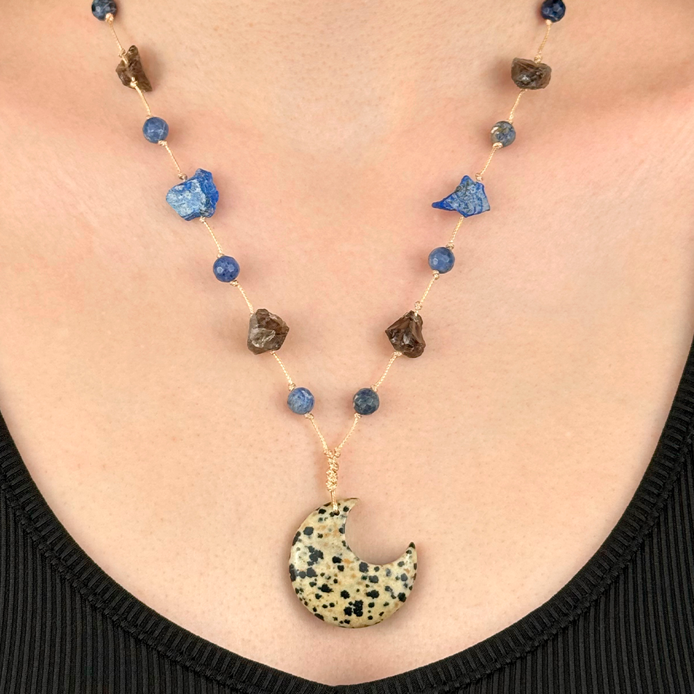 Pleciony Naszyjnik z Księżycem z naturalnego Jaspisu Dalmatyńskiego, Lazurytu i Dymnego Kwarcu