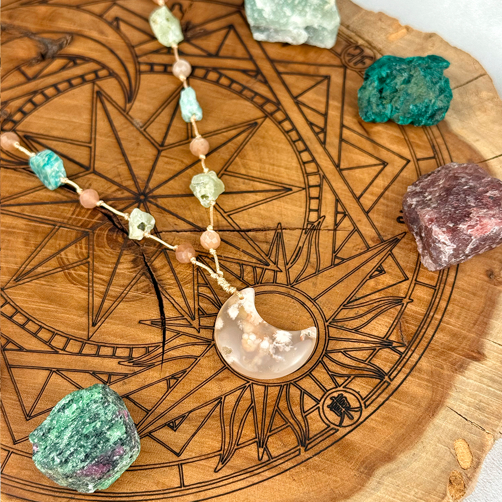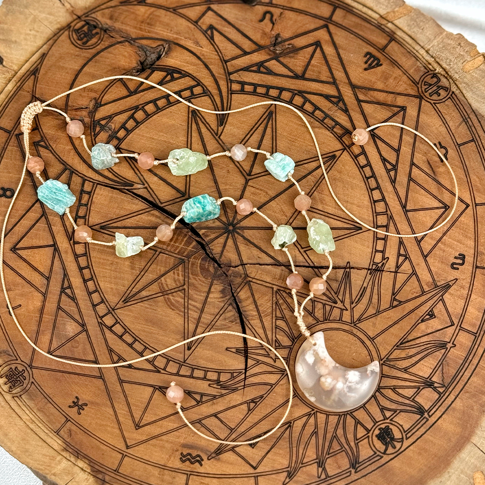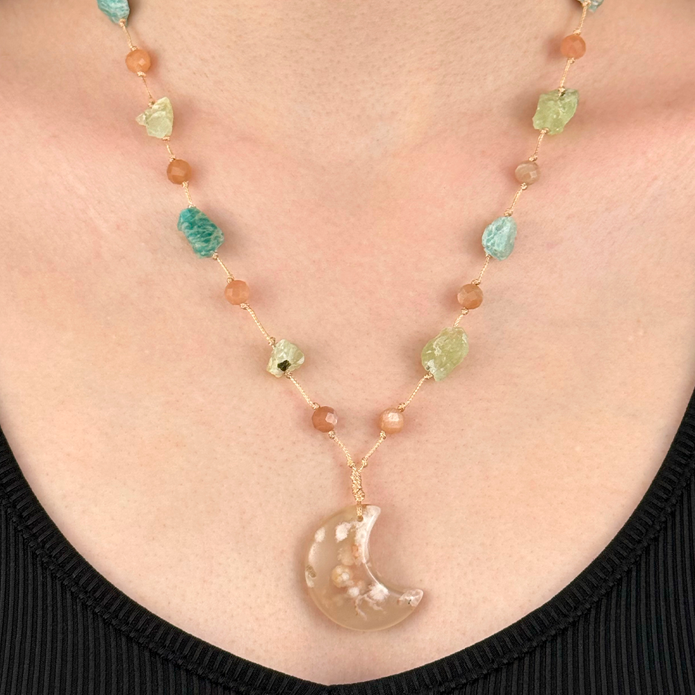 Pleciony naszyjnik z Księżycem wykonany z naturalnego Wiśniowego Agatu, Kamienia Słonecznego, Prehnitu i Amazonitu. Delikatne, a jednocześnie energetyczne połączenie, które wspiera harmonię emocjonalną, wewnętrzny spokój oraz pewność siebie