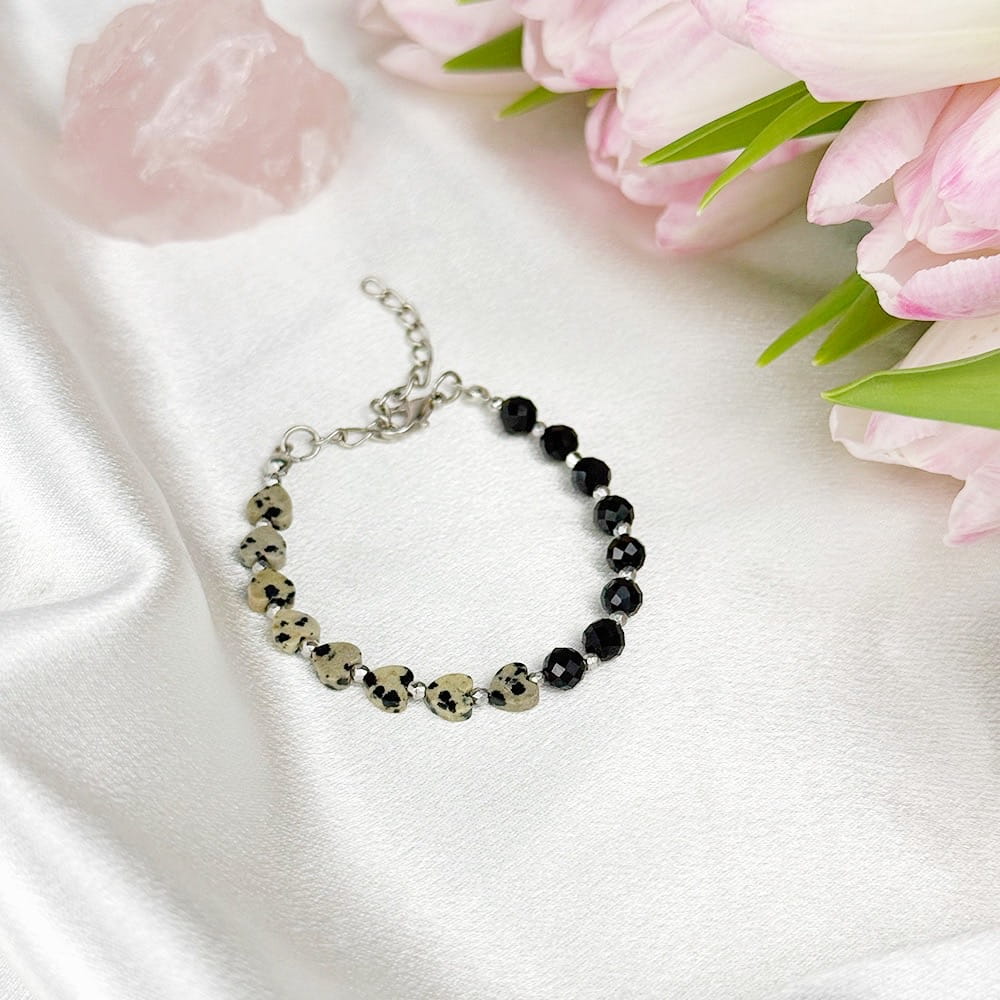 Ta bransoletka łączy dwa silne kamienie ochronne, które wspierają oczyszczanie z negatywnej energii oraz budowanie poczucia bezpieczeństwa.
